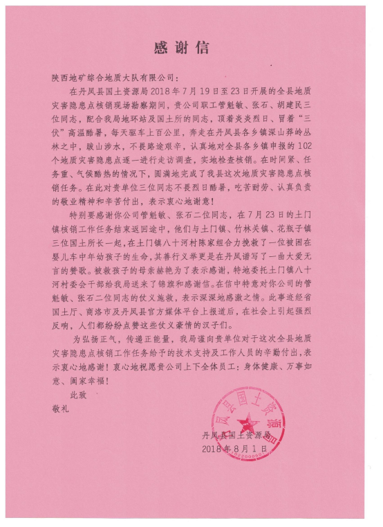 2018年8月1日,一封來自丹鳳縣國土資源局的感謝信,讓我們又一次地把目光聚焦到管魁敏、張石、胡建民三名地質(zhì)工作者,他們愛崗敬業(yè)、吃苦耐勞、對黨的地質(zhì)事業(yè)忠誠,他們是地質(zhì)工作者“三光榮”“四特別”的真實寫照。他們見義勇為、救危扶困,更是社會主義核心價值觀的踐行者,他們將地質(zhì)工作者的職業(yè)素養(yǎng)延伸到生活中,明大德,講公德,守私德,他們?yōu)榈刭|(zhì)工作者贏得了社會尊重,向他們致敬,向廣大地質(zhì)工作者致敬!